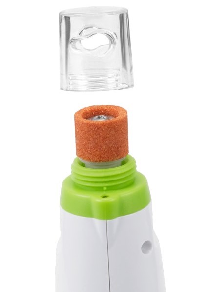 Die verstellbare Schutzkappe fängt abgeschliffene Krallenstücke auf und erleichtert somit die Reinigung und verhindert übermäßiges Trimmen.
