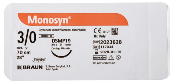 Monosyn ist ein synthetisches, mittelfristig reißfestes, resorbierbares, monofiles Nahtmaterial aus Glykonat, erhältlich in ungefärbt und violett.
